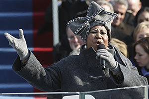 Aretha Franklin singing My Country Tis of Thee, Photo courtesy AP